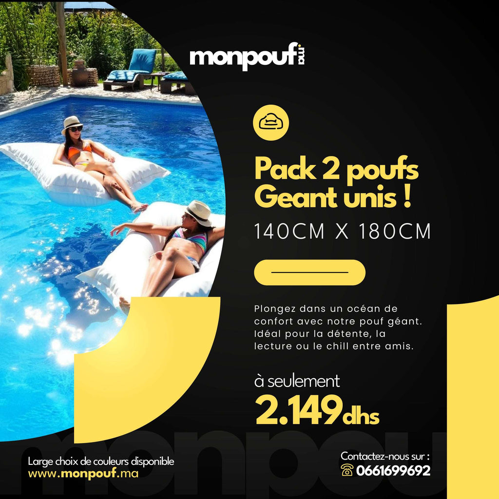 Nos poufs géants sont remplis de billes de polystyrène et recouverts d’un tissu imperméable, ce qui les rend parfaits pour une utilisation aussi bien à l’intérieur (chambre, salon, salle de jeux) qu’à l’extérieur, notamment au bord de la piscine ou dans un jardin.