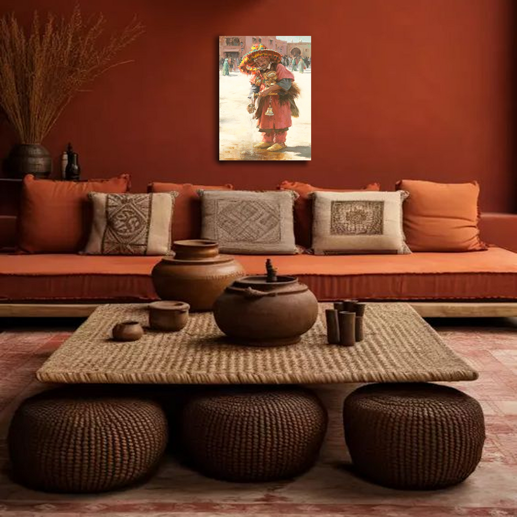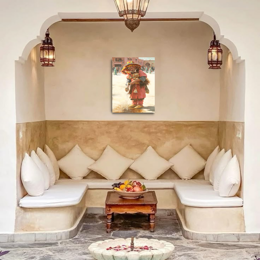 Apportez une ambiance authentique et nostalgique à votre espace avec ce tableau vibrant représentant un porteur d'eau traditionnel marocain.