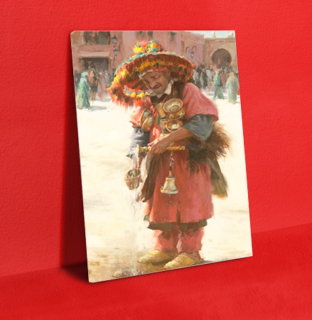 ✨ Scène Culturelle Iconique : Capturant l'essence de la vie quotidienne dans les médinas marocaines, ce tableau met en lumière le métier ancestral de porteur d'eau, un symbole de générosité et de tradition.